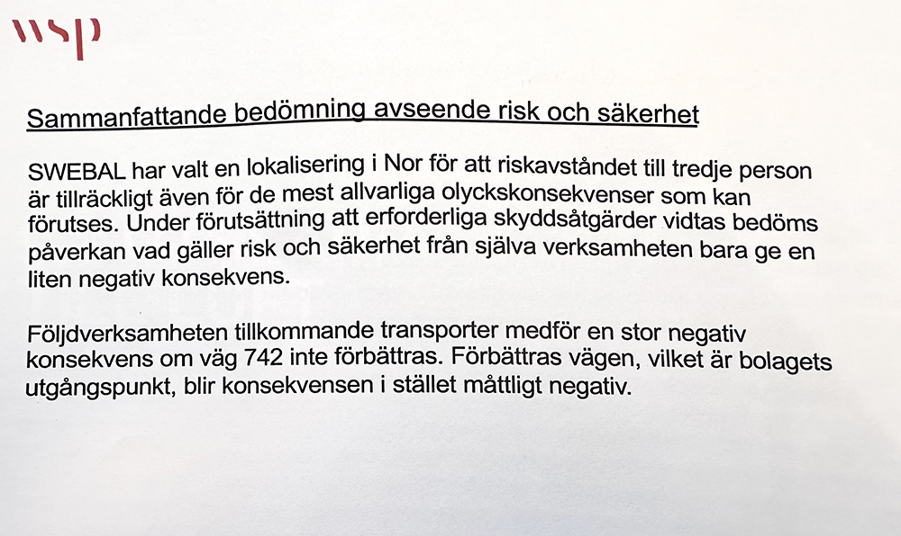 Länstyrelsen har tillstyrkt med vissa villkor kring tillstånd, Mark- & Miljödomstolen har också tillstyrkt med vissa villkor. Vägen finns med i planbeskrivningen och det som diskuterats där är hur säkerheten ska höjas för de boende på 742:an. Målet för oss har varit att beslut ska fattas på grundval av fakta, lagstiftning och långsiktigt ansvar – både för människor, miljö och lokalsamhälle.